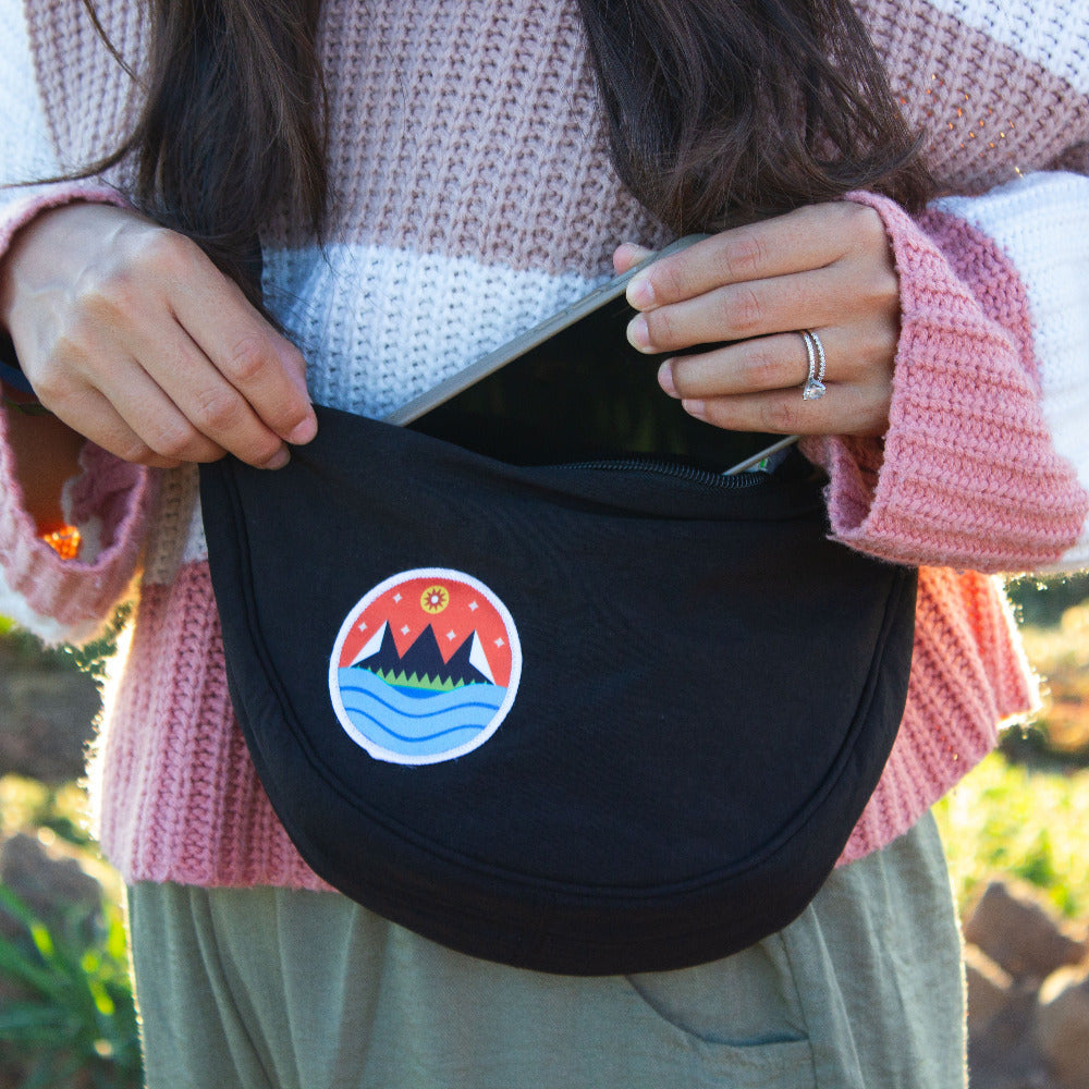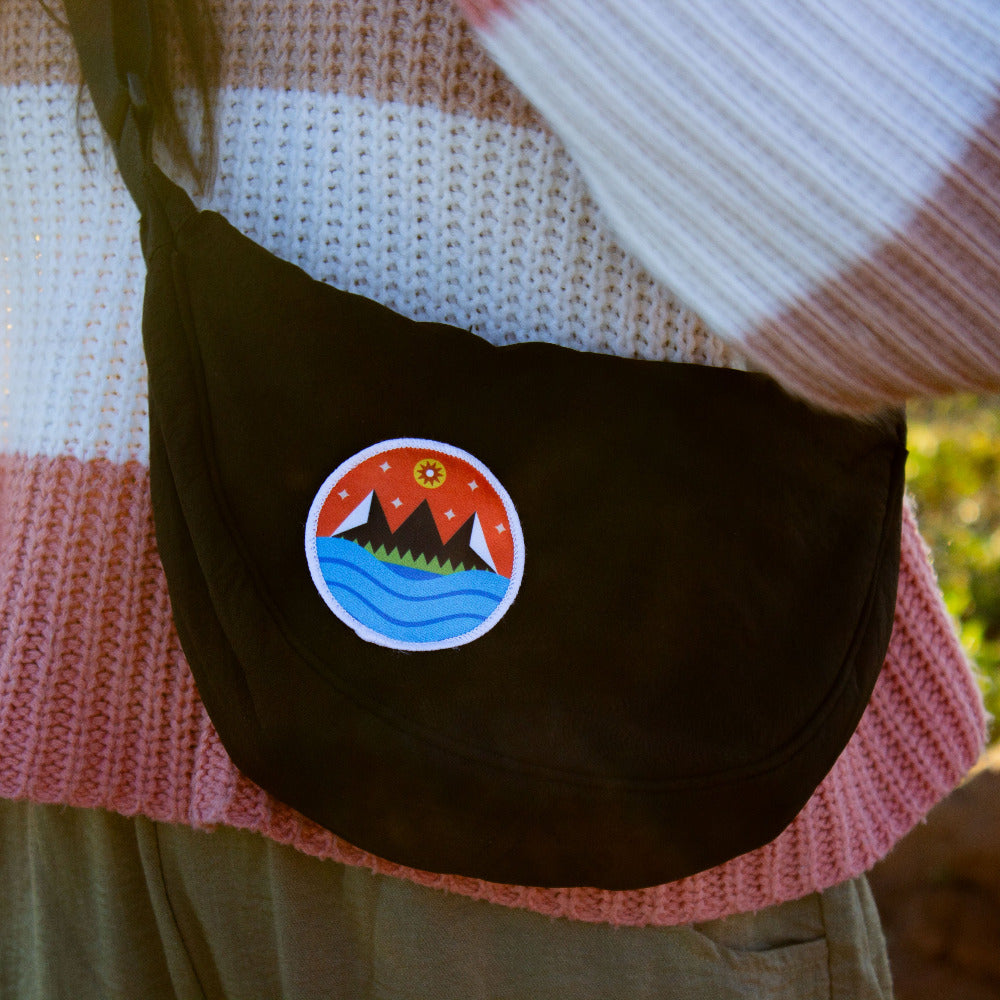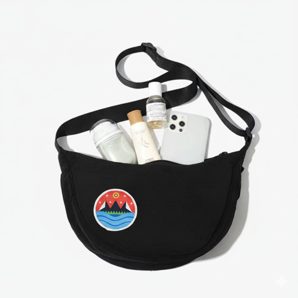 Take your adventures anywhere with this black nylon crossbody bag, featuring our vibrant Starry Mountain patch. Designed for travelers and adventurers, this half moon crossbody bag has a zipper, an adjustable shoulder strap, and offers just the right amount of space for your essentials—making it the ideal crossbody bag for hiking, travel, and everyday wear.