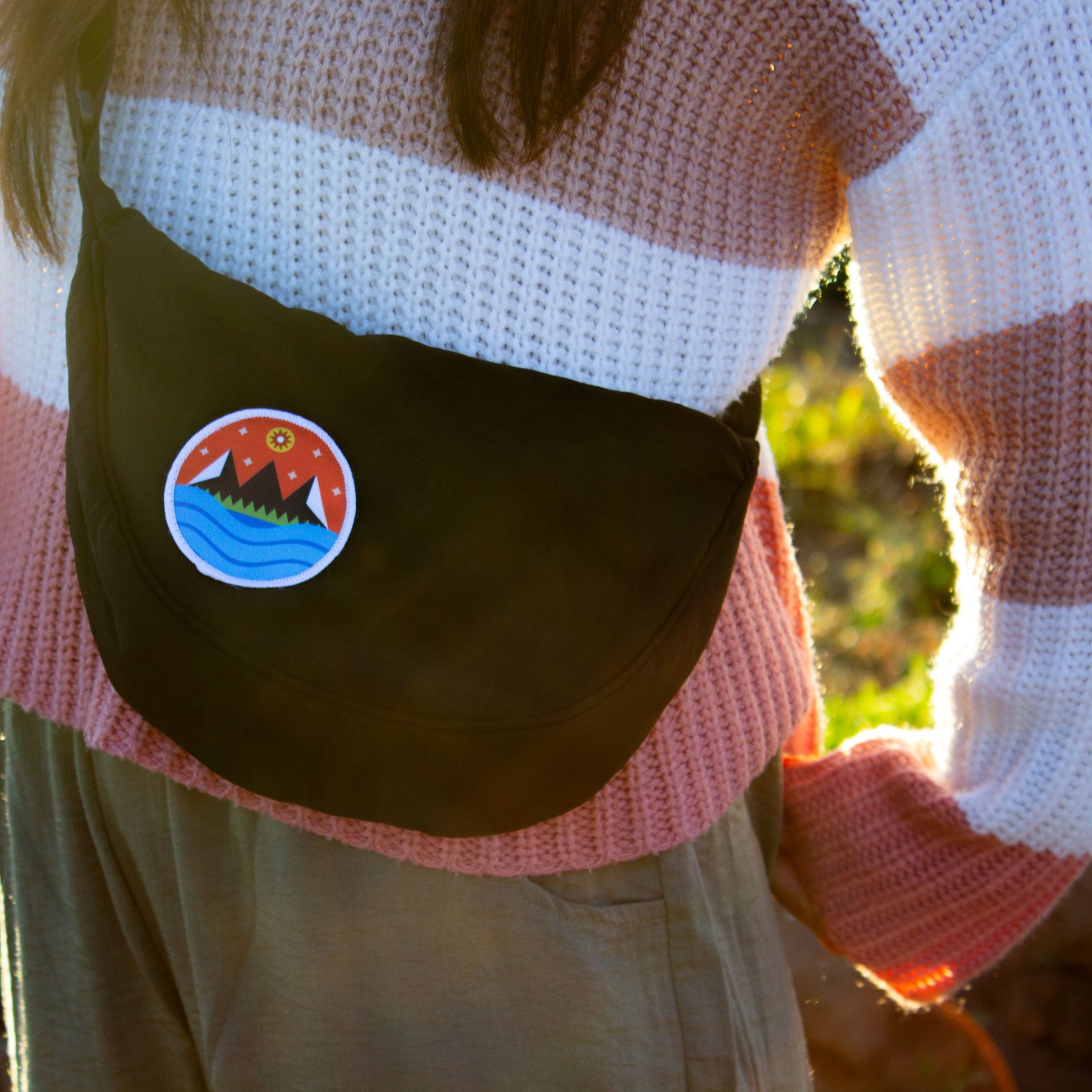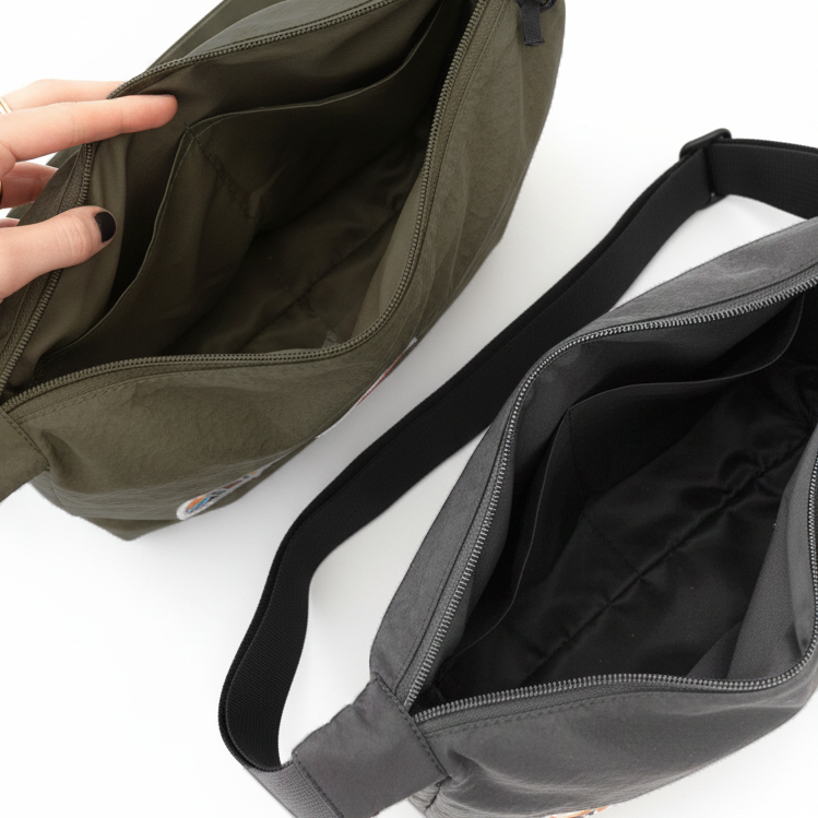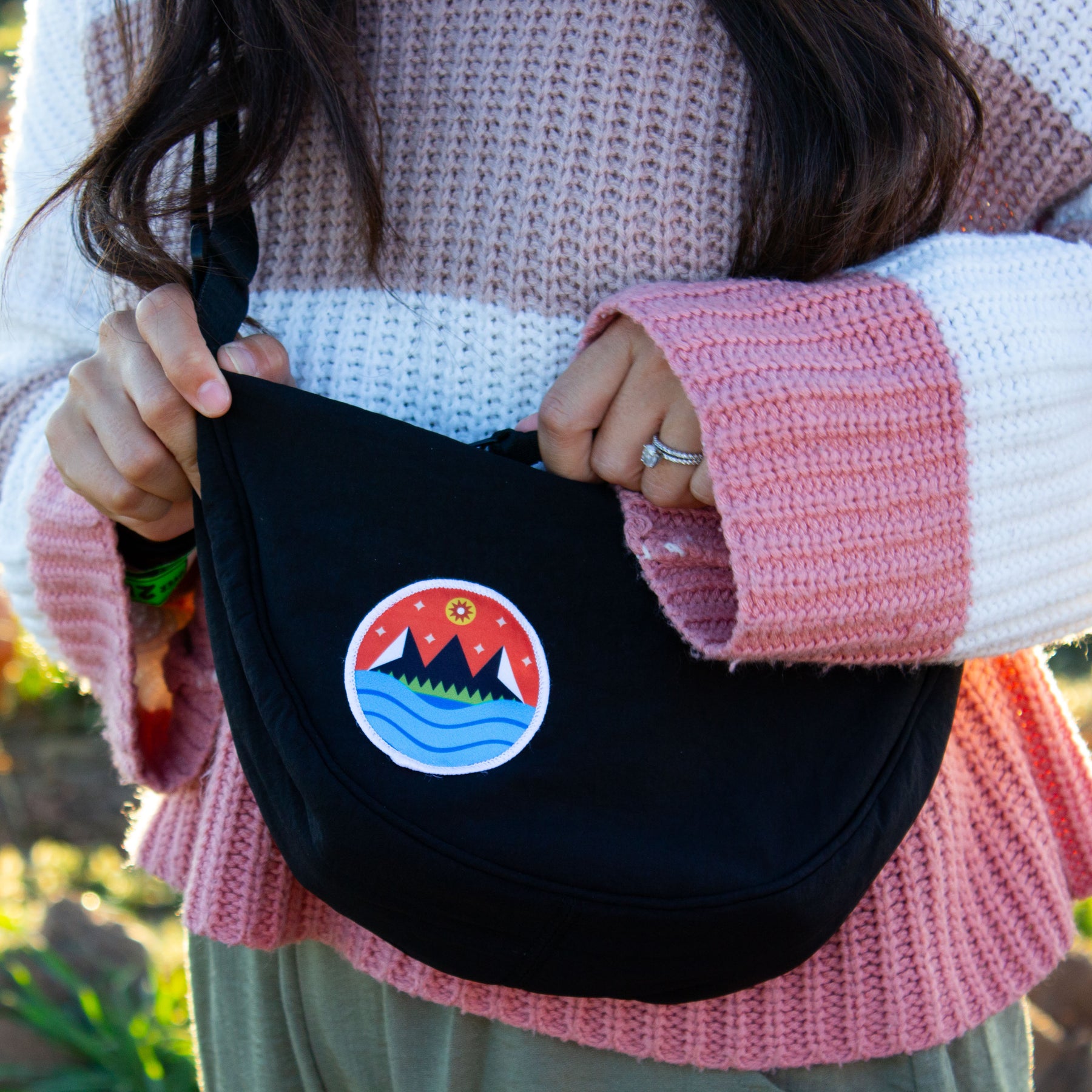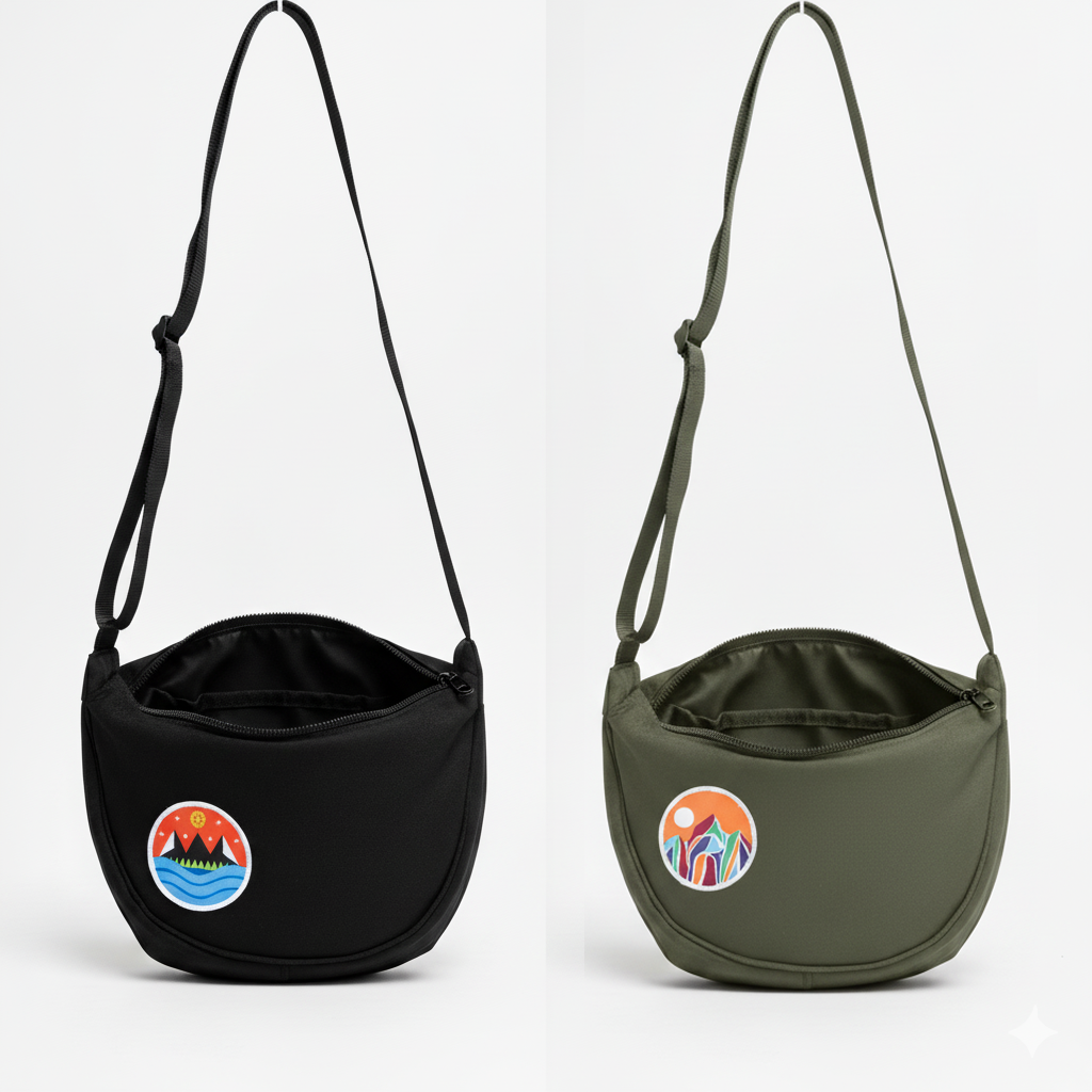 Take your adventures anywhere with this black nylon crossbody bag, featuring our vibrant Starry Mountain patch. Designed for travelers and adventurers, this half moon crossbody bag has a zipper, an adjustable shoulder strap, and offers just the right amount of space for your essentials—making it the ideal crossbody bag for hiking, travel, and everyday wear.