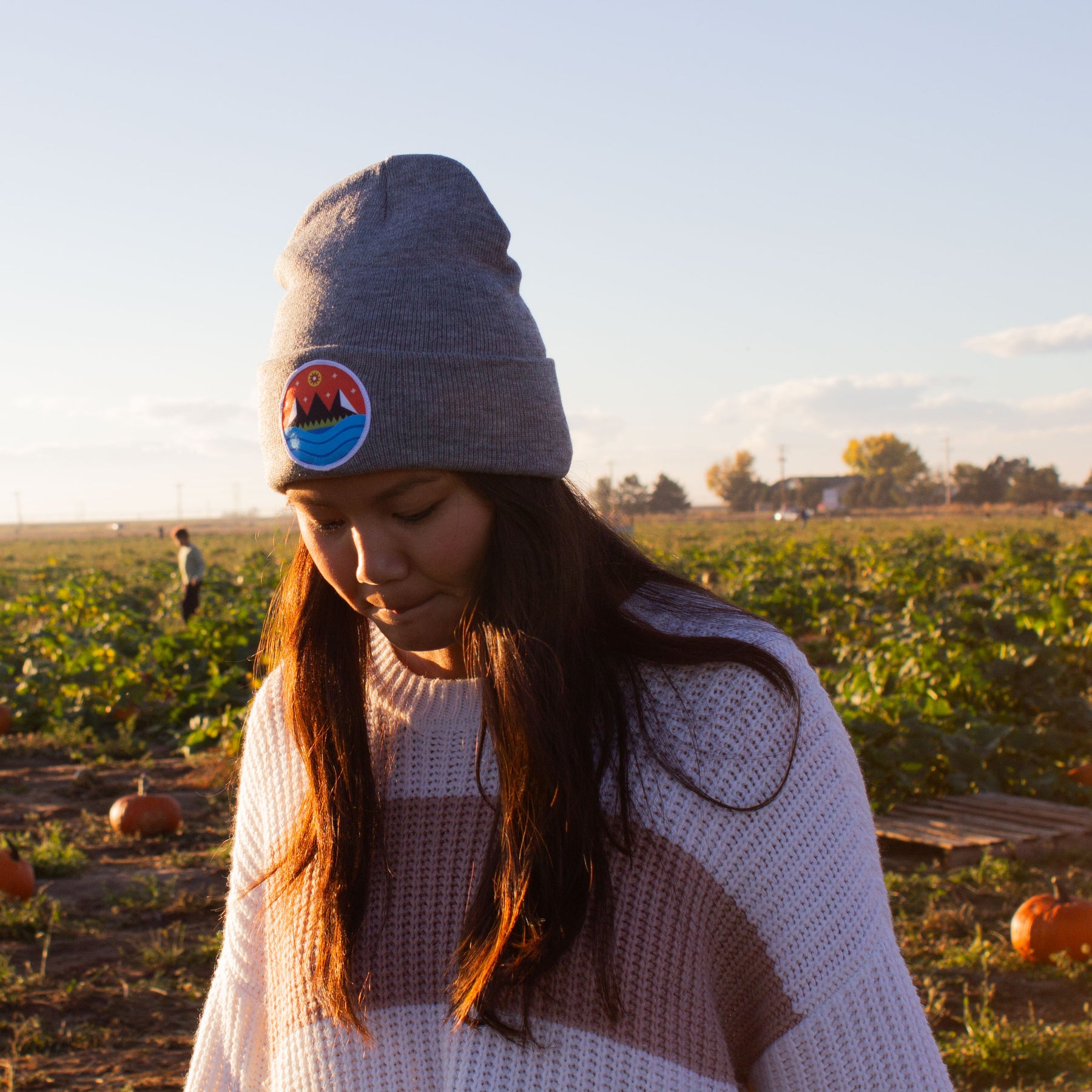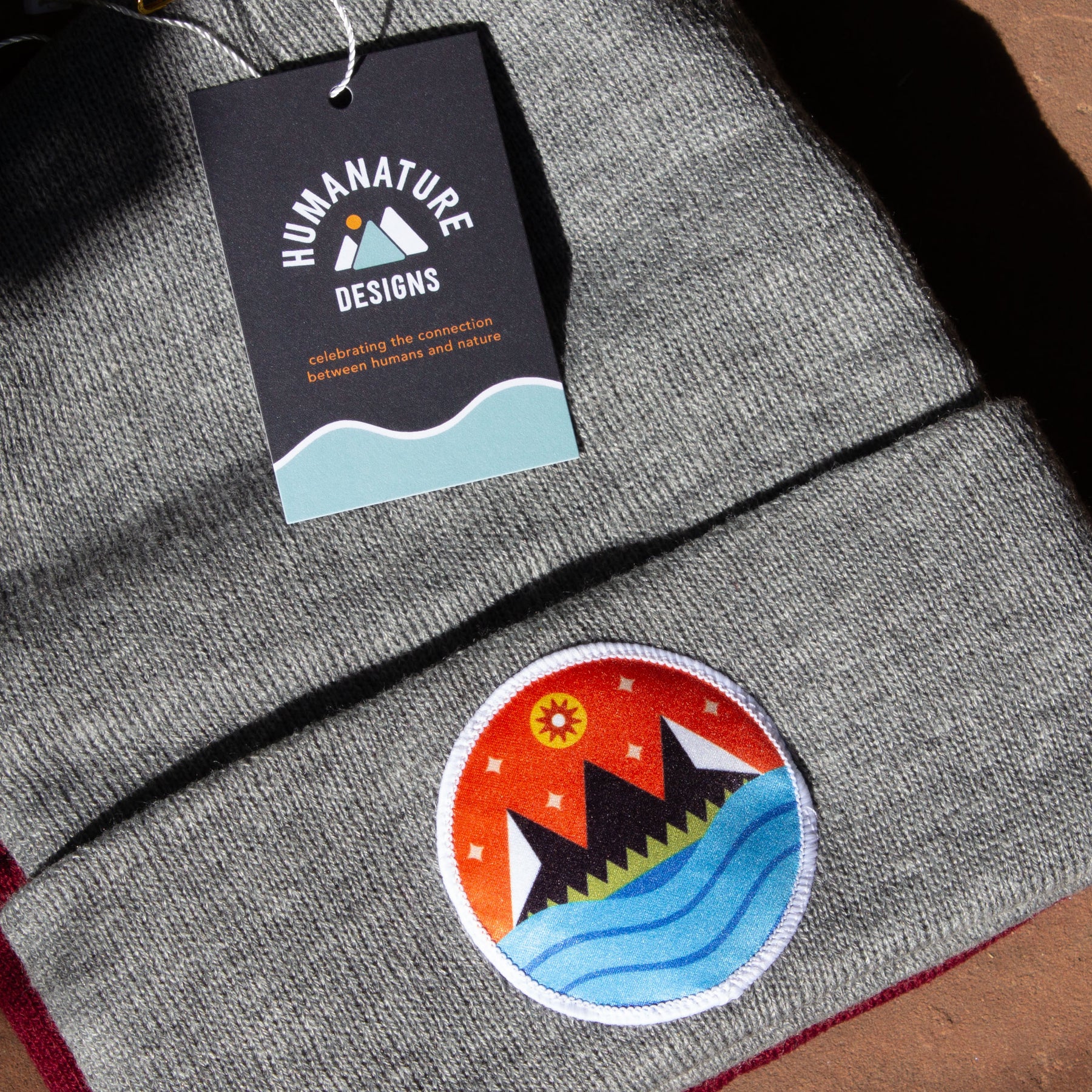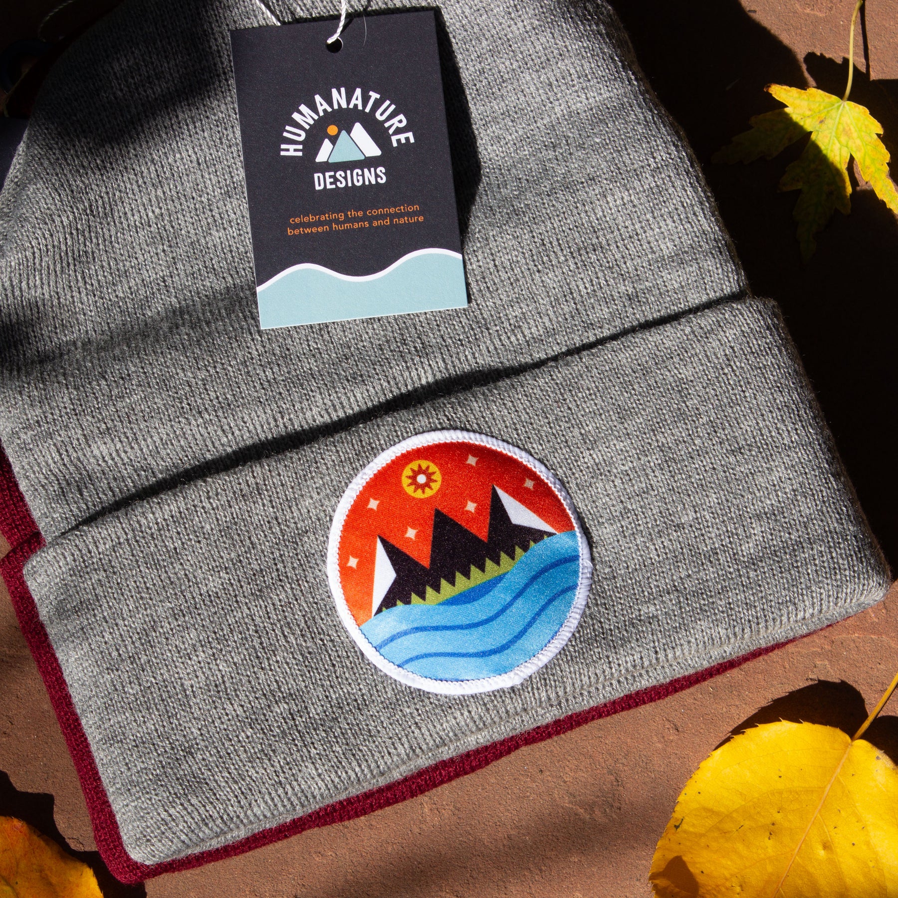 Starry Mountain Patch Beanie - 12" Gray Acrylic Fall Beanie with Mountain Design