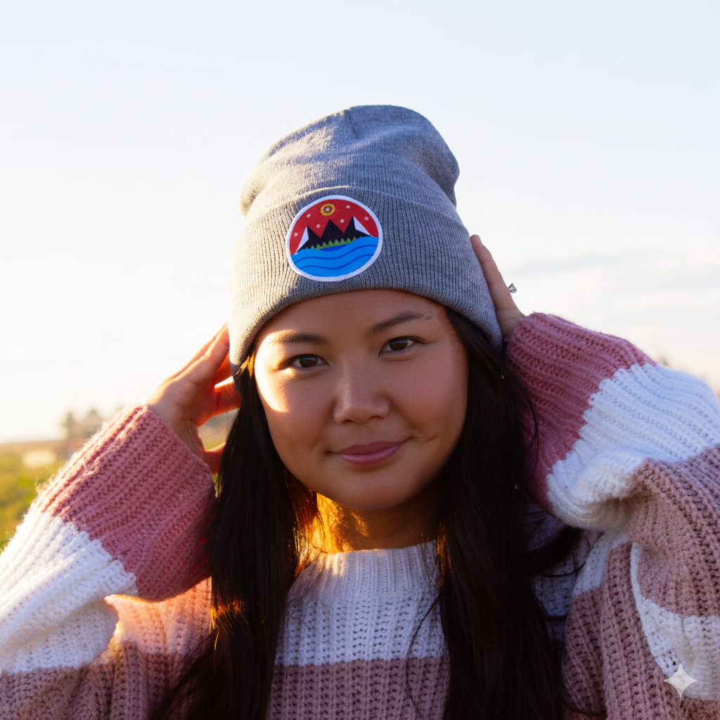 Adventure-ready and effortlessly cool, our Starry Mountain Beanie features a soft gray knit and a vibrant geometric mountain patch inspired by starry nights in the mountains. Crafted from double-layered acrylic, it’s warm yet breathable—ideal for trail days, ski trips, or casual wear around town.