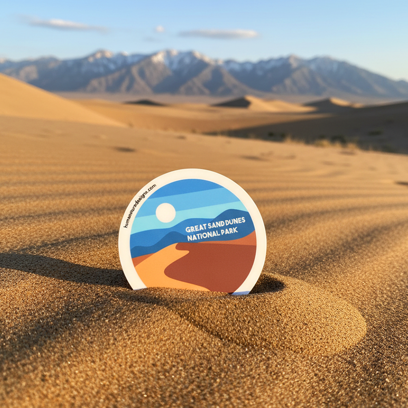 The Great Sand Dunes National Park Sticker captures the striking landscape of sweeping golden sand beneath snow-capped peaks—a design inspired by one of the most unique places in the U.S.